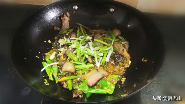 5.鍋里加50克植物油5成熱下肉片翻炒,肉片打卷加尖椒塊、姜蒜末翻炒40秒左右,下炒香的老咸菜、小蔥段翻炒均勻,出鍋成菜。